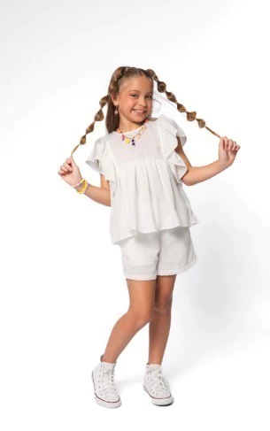 Composto por blusa soltinha com babados delicados e short confortável, ele é perfeito para garantir liberdade nos movimentos sem perder o charme. A modelagem moderna junto ao tom vibrante de verde tornam a peça leve, divertida e cheia de personalidade — ideal para passeios, festas ou momentos especiais.