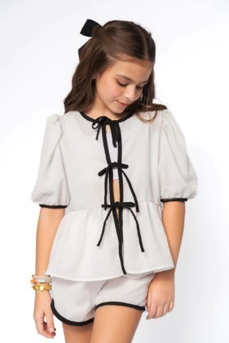 Blusa peplum com amarrações frontais em laço, garantindo um visual leve e sofisticado.