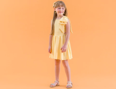Destaca-se pelo maxi laço aplicado em um dos ombros. Possui cintura marcada e saia levemente rodada, ideal para um visual elegante e confortável.