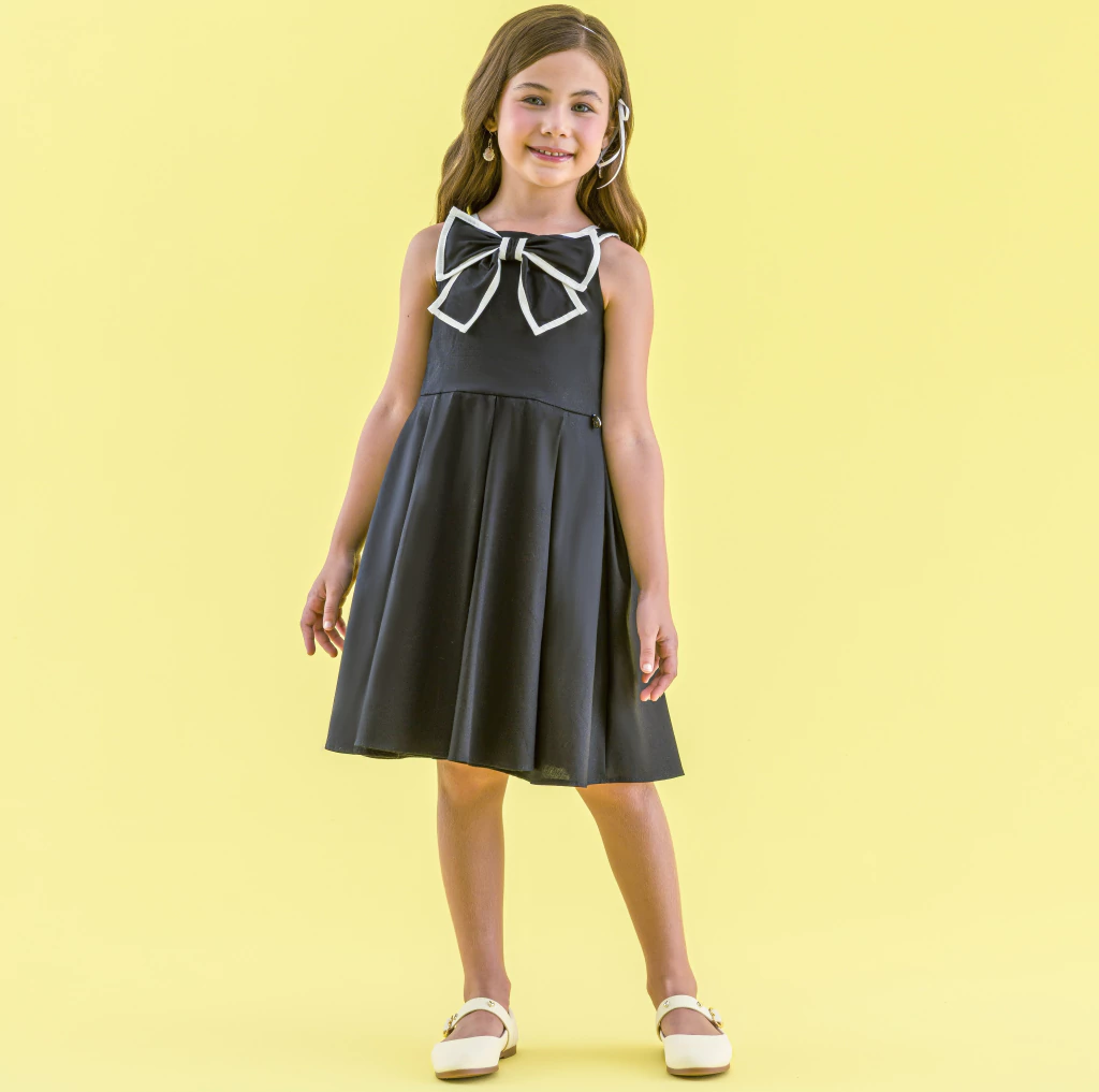 O Elemento Central: Possui um maxi laço em tecido preto no decote, contornado por um vivo (ou borda) branco. Este contraste cria um ponto focal forte, conferindo um charme preppy e sofisticado.
