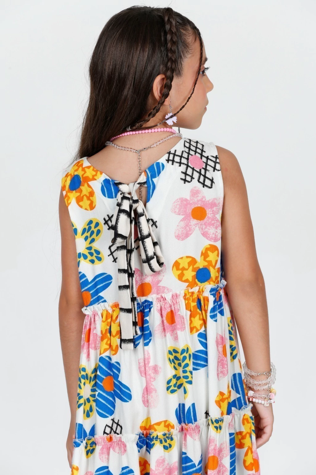 Com modelagem rodada e soltinha, estampa floral vibrante mistura cores alegres como azul, amarelo, rosa e laranja sobre fundo branco, criando um visual moderno e delicado ao mesmo tempo. Sem mangas e com cintura levemente marcada, o caimento valoriza a silhueta infantil sem perder a praticidade. O tecido 100% poliéster é leve, resistente e de fácil manutenção, ideal para os dias quentes e para o uso no dia a dia.